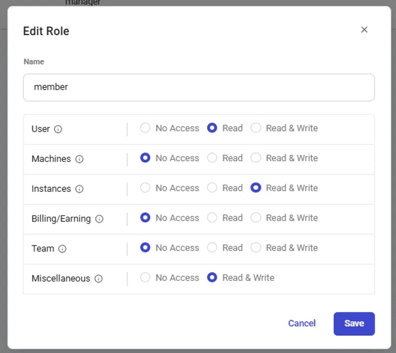 - Member: Has ability to view, create, and interact with instances, but no access to billing info, team management, autoscaler, machines, etc.